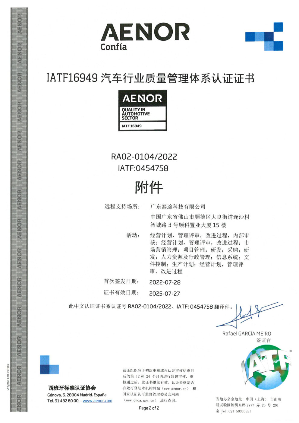 經權威認證機構審核通過,我司廣東泰途科技有限公司再次順利通過了IATF16949:2016質量管理體系認證,并在2022年7月28日正式拿到該證書。通過該體系的認證,表明我司在行車記錄儀和攝像頭模組的設計和制造全面符合IATF16949:2016汽車行業質量管理體系的要求,取得IATF認證標志著我司的產品獲得了進入汽車市場領域的準入綠色通行證,對進一步拓展汽車產品業務產生積極影響。